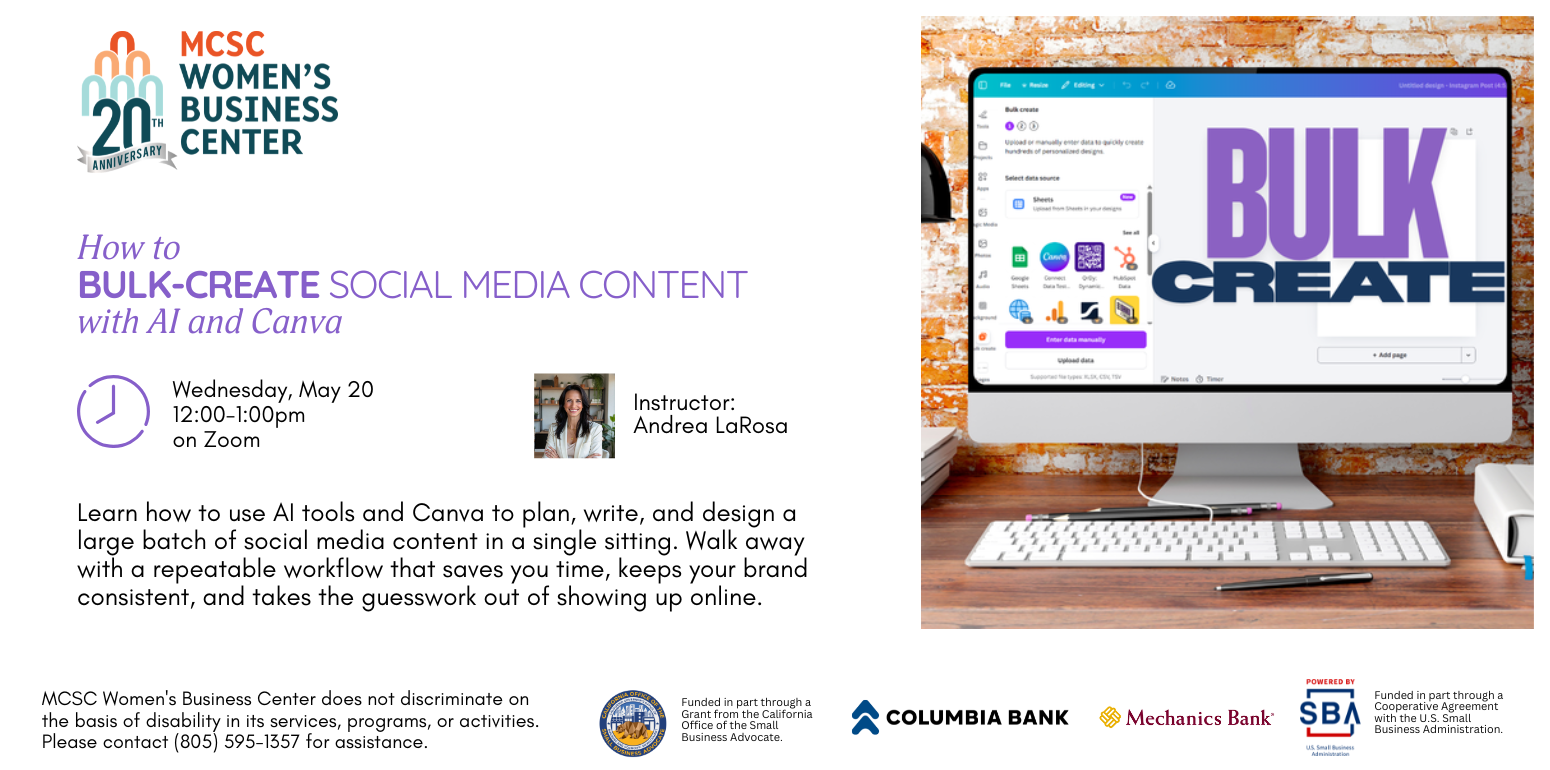 Are you tired of spending hours every week staring at a blank screen? In this one-hour workshop, you'll learn how to use AI tools and Canva to plan, write, and design a large batch of social media content in a single sitting. Walk away with a repeatable workflow that saves you time, keeps your brand consistent, and takes the guesswork out of showing up online.